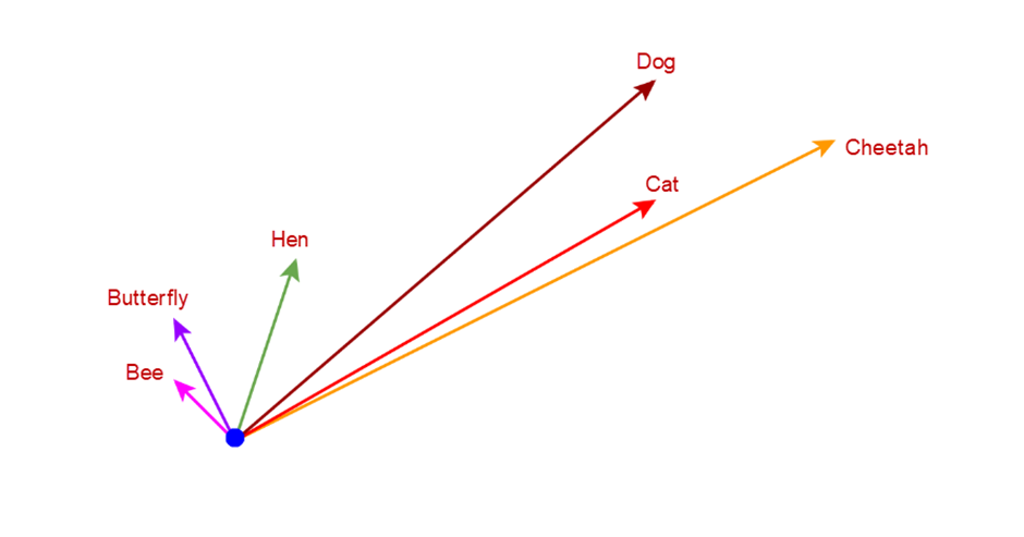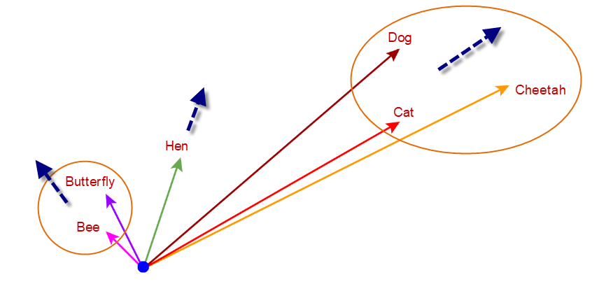 From the above image you can understand that the butterfly and bee are into similar directions, dog, cat, and cheetah are into similar directions. This happens due to the difference in the factors (represented as vector) that we took to plot these animals.